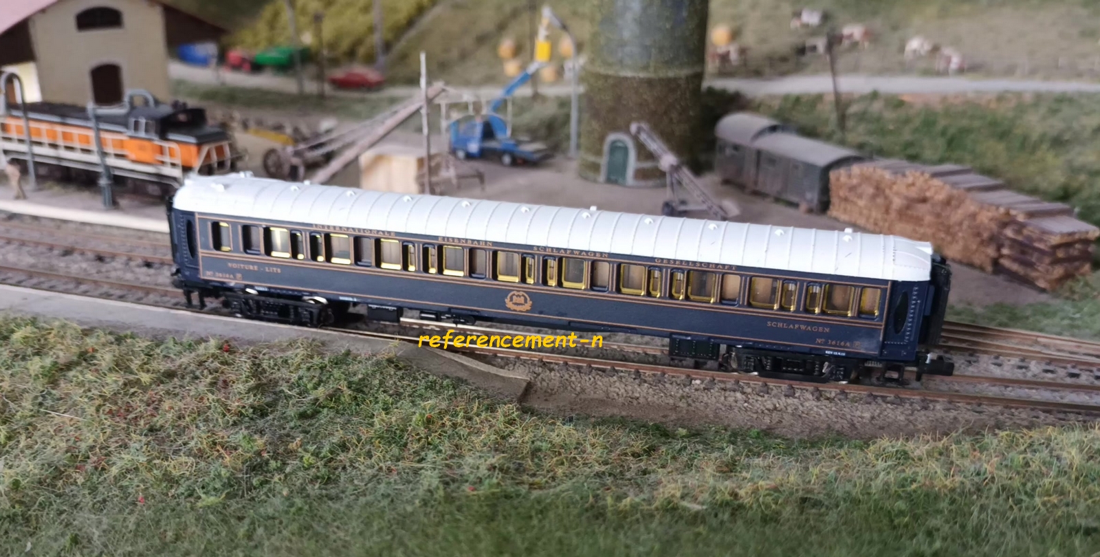 une voiture salon CIWL et une voiture pulmann CIWL, d'un ovale de rails,
