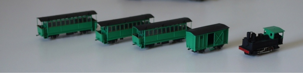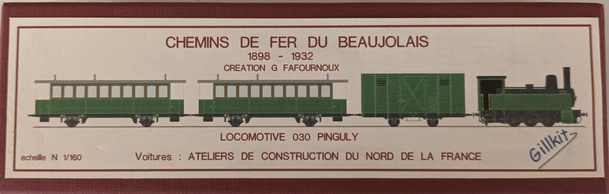 Description | Locomotive vapeur type 030 Pinguely, fourgon à essieux et trois voitures voyageurs à plateforme à essieux en vois métrique (Nm) du CFB (Chemin de Fer du Beaujolais) | |