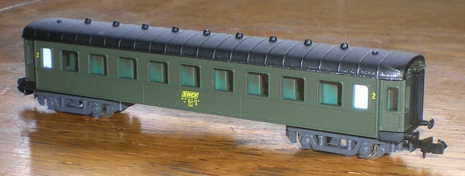 Couleur vert foncé Francisation d'une voiture espagnole proche des anciennes voitures P.O. Présentation Loco Revue N° 448 d'avril 1983 |