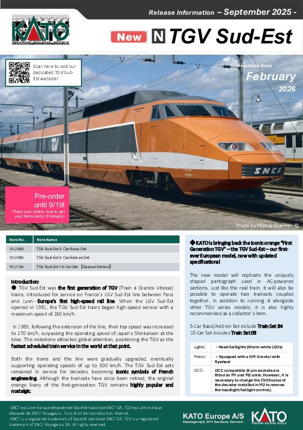 TGV composée des deux motrices et de huit voitures Conditionnenement dans deux coffrets de cinq éléments Annonce dans Rail Miniatire Flash N° 647 de mars/avril 2021 Annonce de la sortie dans Rail Miniatire Flash N° 651 de novembre/décembre 2020 Présentation dans Le Train N° 390 de novembre 2020 Historique de la série de matériel |