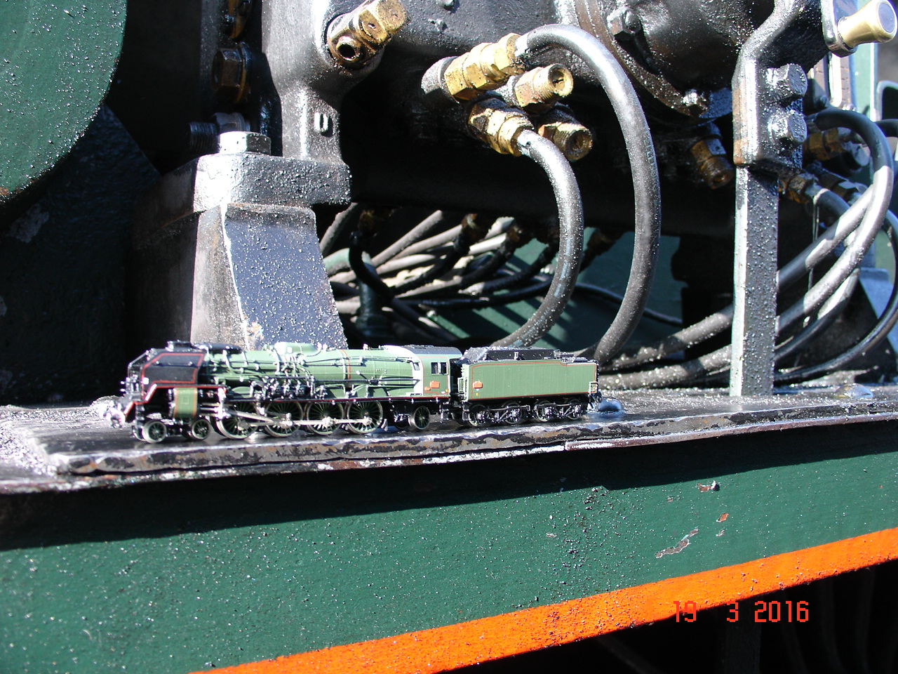 montre une 241-P (échelle N) sur le platelage de la 241-P-17 (échelle 1) au