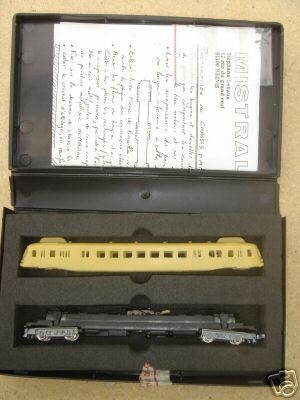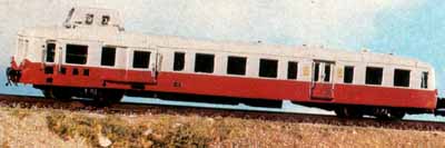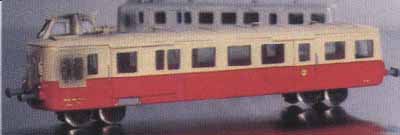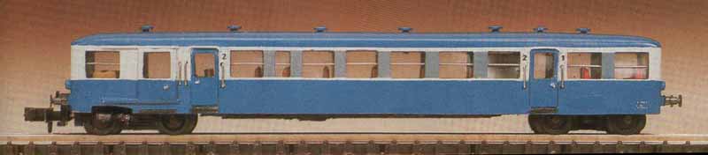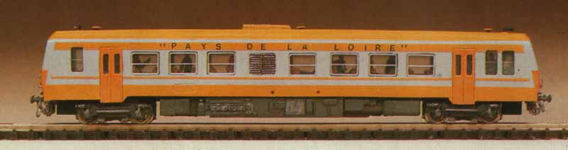 polyuréthane En kit non peint ou tout monté (série prestige) Aménagement intérieur dans les deux cas Monté sur châssis Kato X-92100 Marquage Pays de la Loire Orange et grise en version prestige tout monté en 1986 La dernière photo représente le prototype construit et décrit par Stéphane Levaux dans Loco Revue Annonce dans Loco Revue N° 461 de juin 1984 Test dans Loco Revue N° 464 d'octobre 1984 |