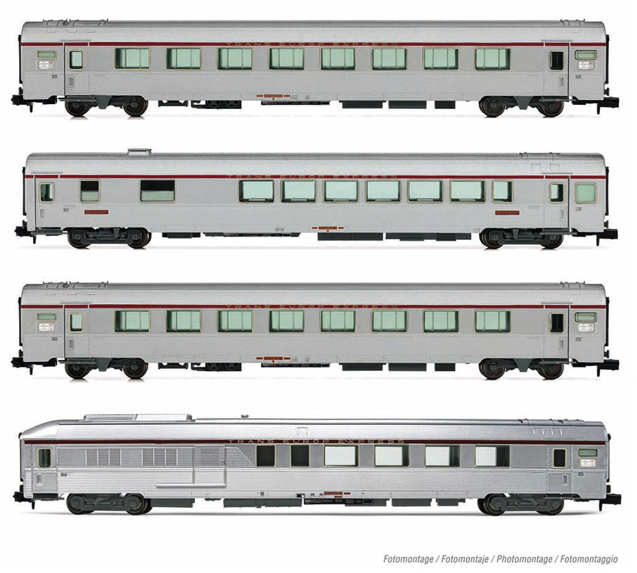 Description | Coffret de quatre voitures inox de type Mistral 69 TEE 1.Cl., une A4Dtux, deux Vru, et une A3rtu pour le train Jules Verne | |