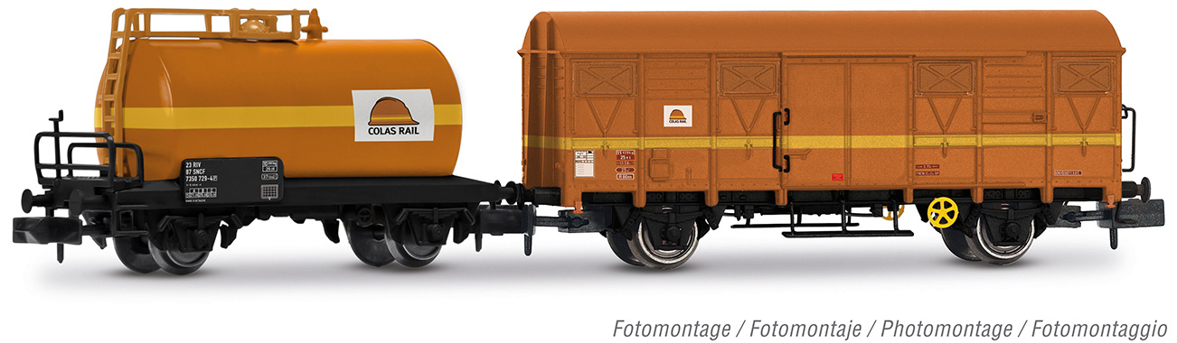 Couleurs orange avec bande jaune Marquages COLAS RAIL Boitier d'attelage court NEM 355 Longueur hors tout : 121 mm Rayon mini : 192 mm |