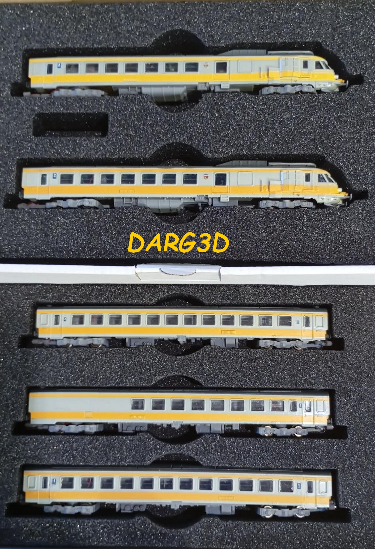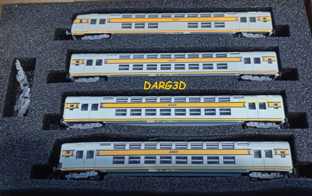 Voitures de Banlieue à 2 Niveaux Couleurs grise, jaune et violette Caisses en impression 3D peintes montées sur châssis DARG3D Historique du modèle |