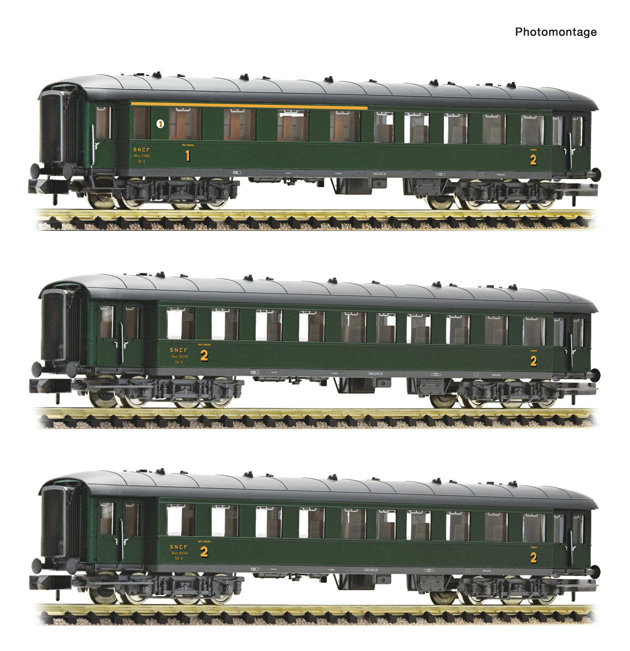 Description | Coffret de trois voitures de voyageurs de type "Bastille", une voiture 1./2.Cl. abmyf, deux voitures 2.Cl. Bmyf | |
