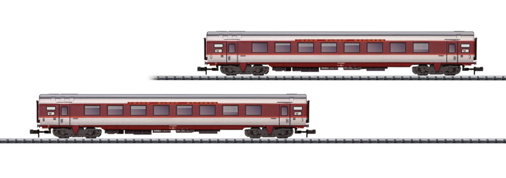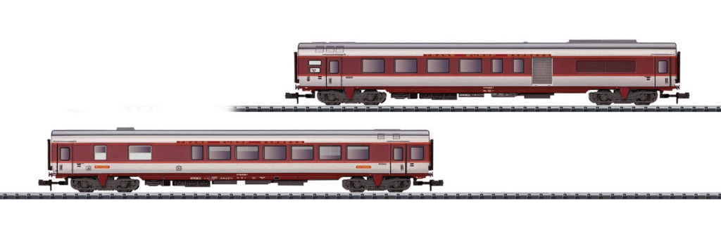 couleurs sur les côtés Logo dégradé Eclairage intérieur par leds en option (Réf. 66616) Attelages à élongation Longueur totale de la rame : 306 mm Annonce dans Loco Revue N° 884 de mars 2021 Annonce de la sortie dans Loco Revue N° 893 de décembre 2021 Coffret complémentaire du coffret 18210 |